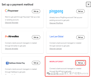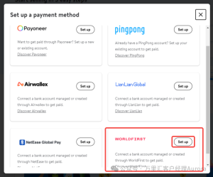 3. 选择「WORLDFIRST」进行收款账户的填写及绑定。